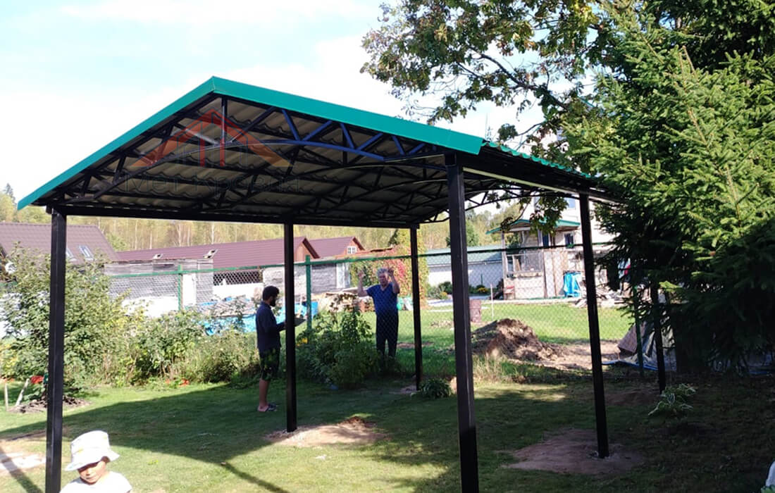 Это автономные сооружения на четырех и более опорах. Они не связаны с другими зданиями, что позволяет разместить их в любой точке участка — например, при въезде для парковки авто или в глубине сада для зоны барбекю.